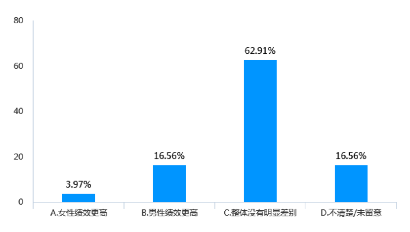 與薪資相對應,在工作績效方面,在受調查企業中,男女員工整體沒有明顯差別的企業占62.91%,認為女員工整體績效更高的企業僅占3.97%,而認為男員工績效更高的企業則有16.56%(見圖13)。