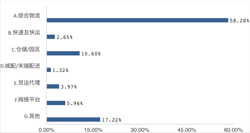 二是各種類型的物流企業全部涵蓋(見圖16)。其中,綜合物流企業最多,占比為58.28%;企業數量占比為17.22%居第二位的是其他類(具體包括專業性物流企業如危化品物流、汽車物流,以及供應鏈管理、物流軟件、冷鏈、智能裝備等類型,且各類數量相對平均);企業數量占比超過10%的還有以倉儲/園區為主業的企業;其他類型則依次是網絡平臺、貨運代理、快遞及快運企業,以及城市/末端配送類企業。