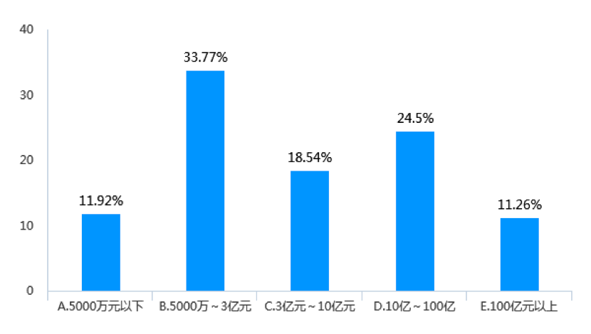 三是受調查企業規模占比最多的為中大型(見圖17)。具體而言,近三年平均主營業務收入為5000萬元~3億元的企業約占1/3,達到33.77%。
