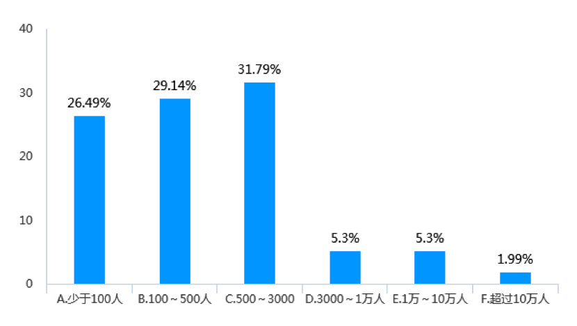 四是受調查企業的人數最多的是500~3000人(見圖18)。從近三年相關企業的平均員工人數看,人員為500~3000人的企業占31.79%;其次是100~500人的企業占比達29.14%;第三是少于100名員工的企業占比也達到26.49%。綜合而言,此次調查企業中,員工數為3000人以下的企業占比達87.42%,超過10萬人的企業占比僅為1.99%。這與我國物流企業數量多、整體而言規模偏小的行業發展特點相符合。