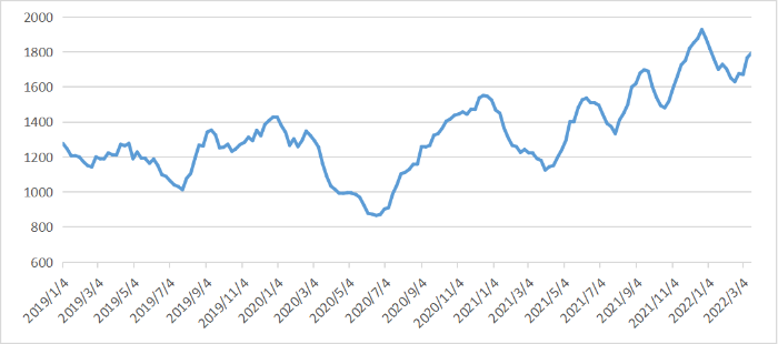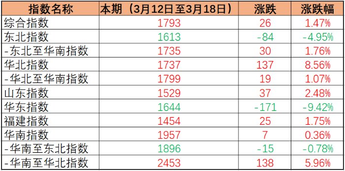 此外,山東指數(shù)報收1529點,環(huán)比上漲37點,漲幅2.48%;華東指數(shù)報收1644點,環(huán)比下降171點,降幅9.42%;福建指數(shù)報收1454點,環(huán)比上漲25點,漲幅1.75%。