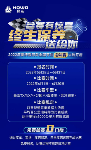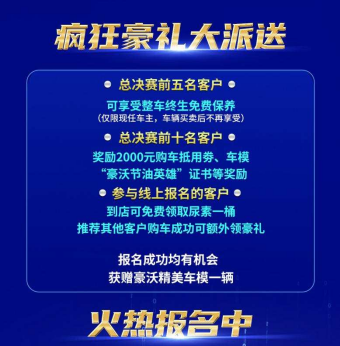 本次大賽更有重磅大獎:比賽成績前五名的客戶,可享受整車終生免費保養(僅限現任車主,車輛買賣后不再享受);前十名客戶可獲得2000元購車抵用券、精美車模、“豪沃節油英雄”榮譽證書等獎勵;而且,只要參與線上報名的客戶,即可到豪沃4S店免費領取尿素一桶,推薦其他客戶購車成功更享額外豪禮;此外,凡報名成功的卡友,均有機會獲贈豪沃精美車模一輛。