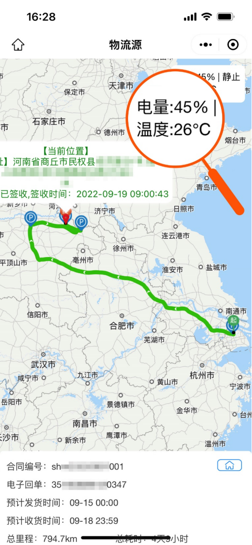 物流源的貨物跟蹤設備——電子回單(冷鏈產品),綁定醫藥品訂單運輸,智能定位及自動溫度監測技術,實時記錄醫藥品運輸的起運時間、運輸軌跡、溫度、到達及簽收時間。醫藥品企業、承運公司及收貨方,可隨時通過微信小程序查詢實時在途信息及運輸溫度,實現全程的可視化溫度監控。