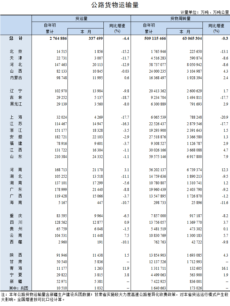 2018年7月公路貨物運輸量