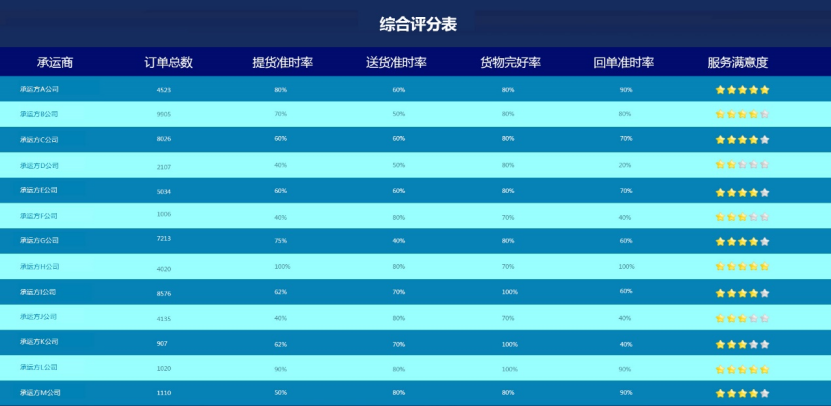 分析的數(shù)據(jù)呈現(xiàn)貨物提貨準(zhǔn)時(shí)率、送貨準(zhǔn)時(shí)率、簽收準(zhǔn)時(shí)率、貨損率等運(yùn)輸服務(wù)考核信息,支撐著企業(yè)不斷提高運(yùn)輸服務(wù)水平,提升上游客戶的服務(wù)體驗(yàn)。