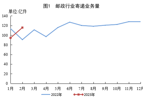 2月份,郵政行業(yè)寄遞業(yè)務(wù)量完成115.7億件,同比增長(zhǎng)27.8%。其中,快遞業(yè)務(wù)量完成91.8億件,同比增長(zhǎng)32.8%;郵政集團(tuán)寄遞業(yè)務(wù)量完成23.9億件,同比增長(zhǎng)11.8%。