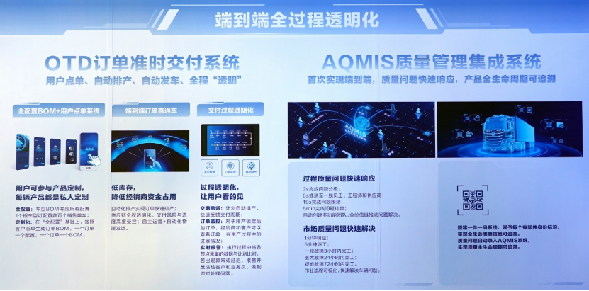 憑借高度的數字化,北汽重卡數字孿生智慧工廠首次在行業實現了“端到端”的革命。將客戶端、產品端、供應商端與工廠端全面數字化打通,并在各端高效精確傳遞。北汽重卡首創全配置BOM+用戶點單,OTD訂單準時交付系統實現訂單端到端打通,全過程透明可參與,把用戶從消費者變成產消者。