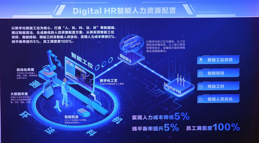 智能人力資源配置——以數字化智能工位為核心,打通“人、機、料、法、環”等數據端,通過智能算法,生成最優的人員資源配置方案,從而實現智能工位安排、智能排班、精益工時及智能人員優化,實現人力成本降低5%,線平衡率提升5%,員工滿意度100%。
