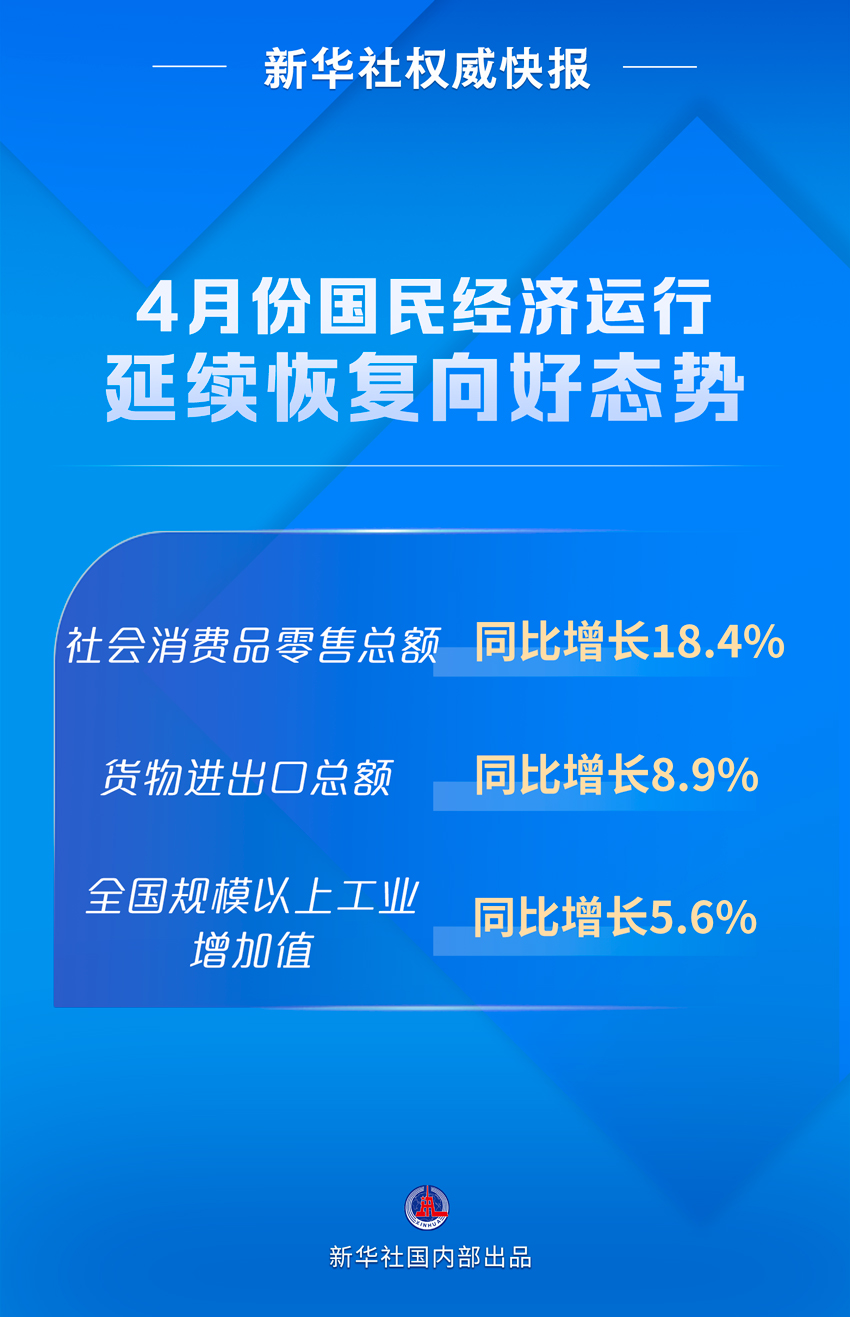 4月份,在以習近平同志為核心的黨中央堅強領導下,各地區各部門堅決貫徹落實黨中央、國務院決策部署,堅持穩中求進工作總基調,完整、準確、全面貫徹新發展理念,加快構建新發展格局,宏觀政策靠前協同發力,經濟社會全面恢復常態化運行,多數生產需求指標同比增速提升,服務業和消費恢復較快,就業物價總體穩定,經濟運行延續恢復向好態勢。
