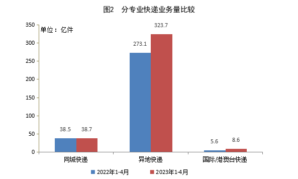 1-4月,同城快遞業(yè)務量累計完成38.7億件,同比增長0.7%;異地快遞業(yè)務量累計完成323.7億件,同比增長18.5%;國際/港澳臺快遞業(yè)務量累計完成8.6億件,同比增長54.1%。