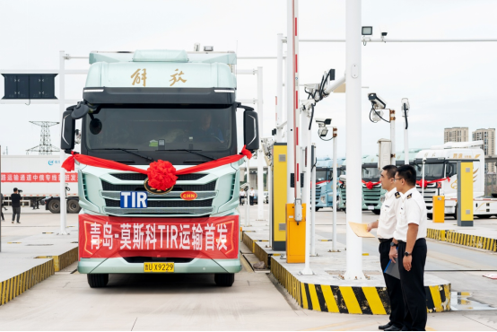 儀式現場,解放青汽鷹途作為TIR運輸車輛,滿載包裝材料、建材、輪胎等貨物,在膠州海關的監管下,從位于中國傳化(上合)國際物流港海關監管作業場所內的TIR國際道路運輸集結中心順利啟動出發,預計8天后這批貨物將到達9800公里外的俄羅斯首都莫斯科,完成上合示范區首次中俄TIR專線國際道路運輸。這是山東省首條中俄TIR道路運輸專線,也是山東省與歐亞大陸互聯互通的新通道。
