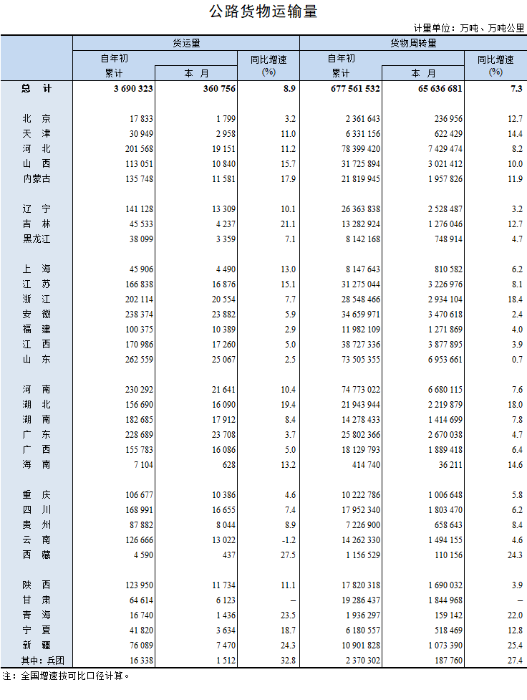 2023年11月公路貨物運輸量