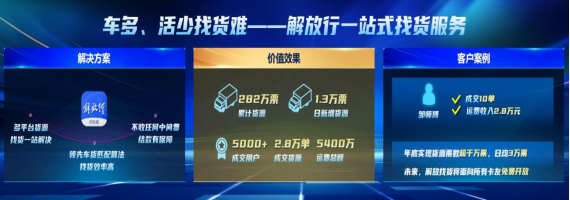 針對卡友“找貨難”的痛點,“解放行”App上推出一站式“找貨服務”。當中匯集多個平臺貨源,通過行業領先的車貨匹配算法,讓一手貨源直達卡友,所有貨源免費提供,貨源真實有保障,實現“好車找好貨,好貨找好車”。