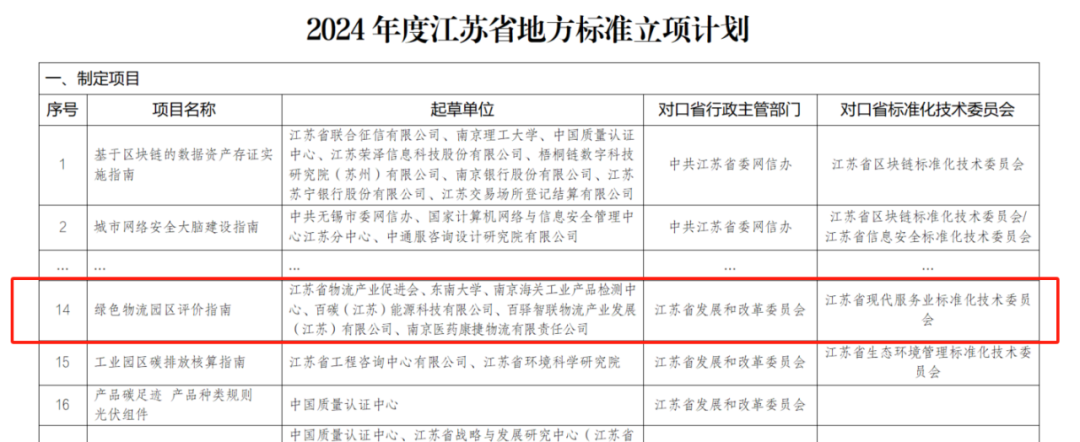 近日,由江蘇省物流產業促進會主導申請的《綠色物流園區評價指南》成功獲批立項。該標準聯合東南大學、南京海關工業產品檢測中心、百碳(江蘇)能源科技有限公司等企事業單位共同開展編制工作。