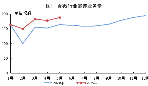 5月份,郵政行業寄遞業務量完成187.8億件,同比增長14.8%。其中,快遞業務量完成173.2億件,同比增長17.2%。