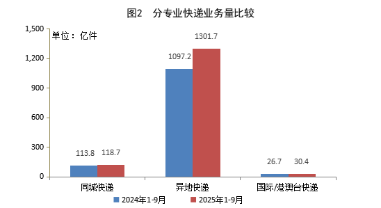 1-9月,同城快遞業(yè)務量累計完成118.7億件,同比增長4.3%;異地快遞業(yè)務量累計完成1301.7億件,同比增長18.6%;國際/港澳臺快遞業(yè)務量累計完成30.4億件,同比增長13.7%。