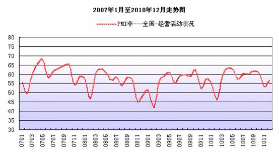 2010年12月,中國(guó)物流與采購(gòu)聯(lián)合會(huì)(CFLP)發(fā)布中國(guó)非制造業(yè)商務(wù)活動(dòng)指數(shù)為56.5%,比上月回升3.3個(gè)百分點(diǎn),比去年同期降1.0個(gè)百分點(diǎn)。與07年、09年均值降1個(gè)百分點(diǎn)左右。由于非制造業(yè)沒(méi)有綜合指數(shù),通常以商務(wù)活動(dòng)狀況指數(shù)來(lái)反映非制造業(yè)經(jīng)濟(jì)的總體變化。看收費(fèi)價(jià)格,非制造業(yè)未來(lái)經(jīng)營(yíng)尚有空間,環(huán)比值0.1,同比值為1.7個(gè)百分點(diǎn),好于往年均值,但同時(shí)提示通脹風(fēng)險(xiǎn)。中間投入價(jià)格環(huán)比微降0.7,同比升5.9,高于往年均值,比收費(fèi)價(jià)格升幅大,但出現(xiàn)向下趨勢(shì),對(duì)未來(lái)利潤(rùn)有一定利好影響。總體數(shù)據(jù)表現(xiàn)比較穩(wěn)健,前期制造業(yè)的景氣在非制造業(yè)中繼續(xù)傳導(dǎo)。