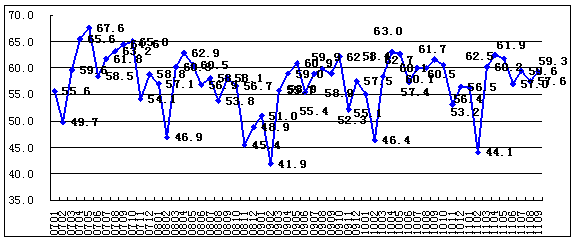 2011年9月,中國(guó)物流與采購(gòu)聯(lián)合會(huì)(CFLP)發(fā)布的中國(guó)非制造業(yè)商務(wù)活動(dòng)指數(shù)為59.3%,比上月上升1.7個(gè)百分點(diǎn)。本月中國(guó)非制造業(yè)PMI各單項(xiàng)指數(shù)中,存貨指數(shù)較上月上升,收費(fèi)價(jià)格指數(shù)較上月持平,其余各指數(shù)的環(huán)比均呈現(xiàn)不同程度回落。