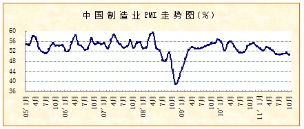2011年10月份,中國物流與采購聯合會發布的中國制造業采購經理指數(PMI)為50.4%,環比回落0.8個百分點。該指數經歷前兩月小幅回升后,再次轉為下跌,但繼續保持在50%以上。反映出四季度經濟增速仍有繼續下調的可能,但適度增長的基本態勢不會根本改變,全年經濟增長將保持9.2%左右的水平。