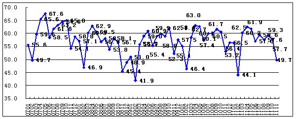 2011年11月,中國物流與采購聯合會(CFLP)發布的中國非制造業商務活動指數為49.7%,比上月回落8.0個百分點。由于非制造業沒有綜合指數,通常以商務活動指數來反映非制造業經濟的總體變化。本月中國非制造業PMI各單項指數中,業務活動預期指數小幅上升,其余各指數環比均呈現不同程度回落。