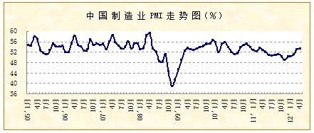 中國物流與采購聯(lián)合會和國家統(tǒng)計局服務(wù)業(yè)調(diào)查中心發(fā)布的4月份中國制造業(yè)采購經(jīng)理指數(shù)(PMI)為53.3%,比上月上升0.2個百分點。該指數(shù)經(jīng)歷連續(xù)五個月回升之后,已經(jīng)高于去年同期水平,顯示宏觀經(jīng)濟(jì)在趨穩(wěn)的基礎(chǔ)上朝著向好的方向發(fā)展。