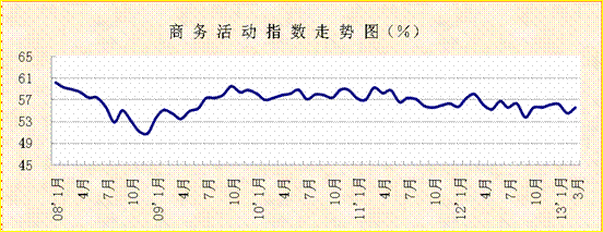 中國物流與采購聯合會、國家統計局服務業調查中心發布的2013年4月份中國非制造業商務活動指數較上月有所回落,但仍保持在54.5%的較高水平,意味著非制造業經濟依然保持平穩增長態勢。從分項指數看,從業人員指數和業務活動預期指數較上月均有回升,表明市場運行基礎依然良好。