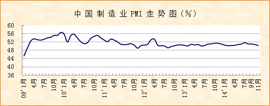 中國物流與采購聯合會、國家統計局服務業調查中心發布的2014年11月份中國制造業采購經理指數(PMI)為50.3%,較上月回落0.5個百分點。該指數最近兩月連續回落,降至去年同期水平以下,與一季度平均值基本相當,反映出當前經濟運行仍有下行壓力。但隨著“穩增長”的政策措施累積效應、合力作用持續顯現,企業生產經營成本下降、適應市場自我調整的步伐加快,目前穩經濟的積極力量也在不斷增強,后期經濟運行有望逐漸轉向平穩。