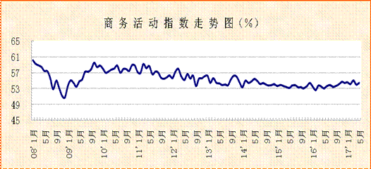 中國物流與采購聯合會、國家統計局服務業調查中心發布的2017年5月份中國非制造業商務活動指數連續八個月保持在54%以上,環比上升0.5個百分點,達到54.5%,表明非制造業經營活動增速加快。分項指數變化顯示,新訂單指數環比小幅回升,連續九個月運行在50%以上;投入品價格指數連續五個月環比回落;從業人員指數穩定在49%左右;業務活動預期指數環比上升。綜合指數變化,非制造業延續穩中有進的發展態勢,經濟發展的質量和效益空間有望繼續拓展。