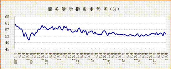 中國物流與采購聯合會、國家統計局服務業調查中心發布的2017年10月份中國非制造業商務活動指數較上月有所回調,但指數仍保持在54.3%的較高水平運行,表明非制造業未改較快增長趨勢,仍處于活躍發展區間。