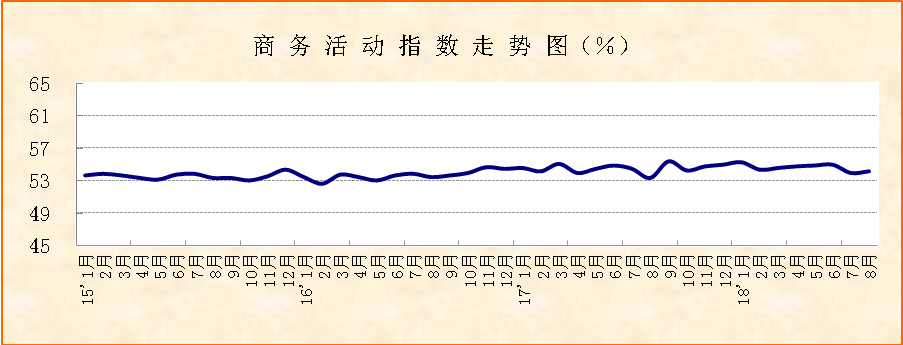 中國物流與采購聯合會、國家統計局服務業調查中心發布的2018年8月份中國非制造業商務活動指數環比小幅上升0.2個百分點,達到54.2%,連續12個月保持在54%以上的較高水平。分項指數顯示,新訂單指數穩定在50%以上,從業人員指數持續上升,業務活動預期指數升幅明顯。綜合指數變化,非制造業整體穩健較快運行格局未變。